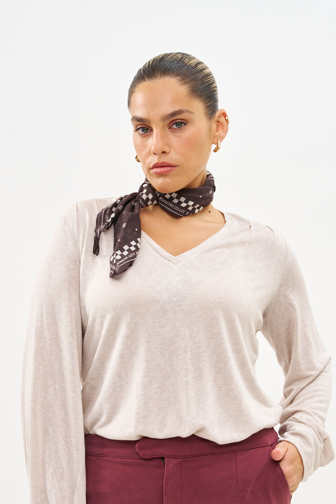 MELISSA CAMEL AND WHITE SHIRT