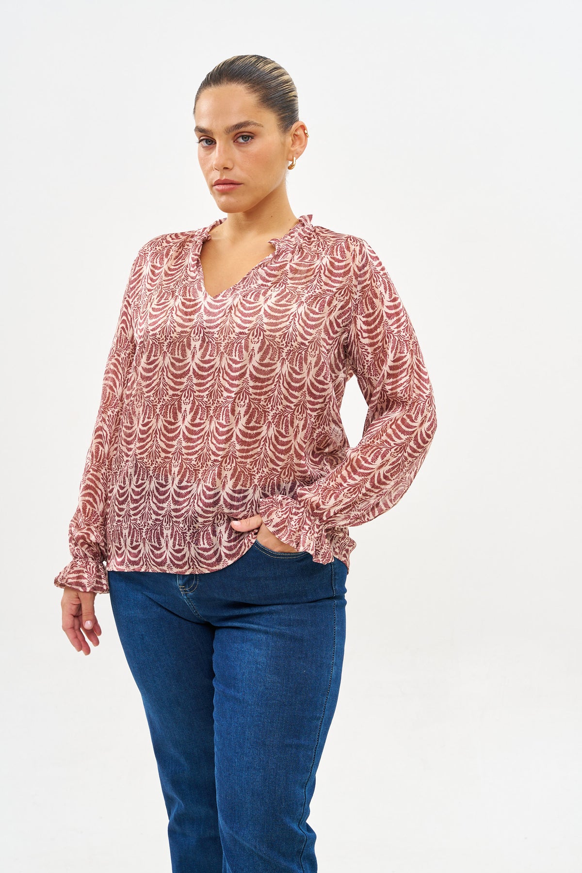 חולצת שיפון מודפס שזור בחוטי זהב עדינים