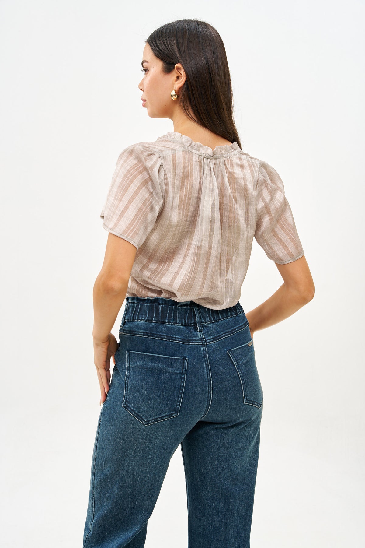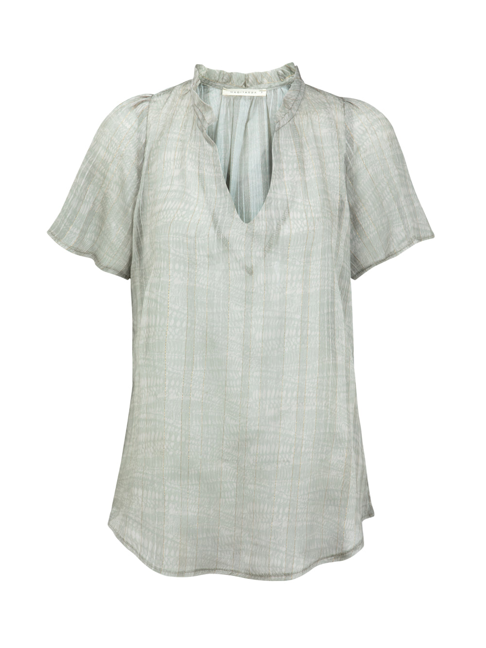 חולצת שיפון דפוס עדין שזור חוט מוזהבצווארון סיני כיווצים -V קטן עם שרוולי פעמון
