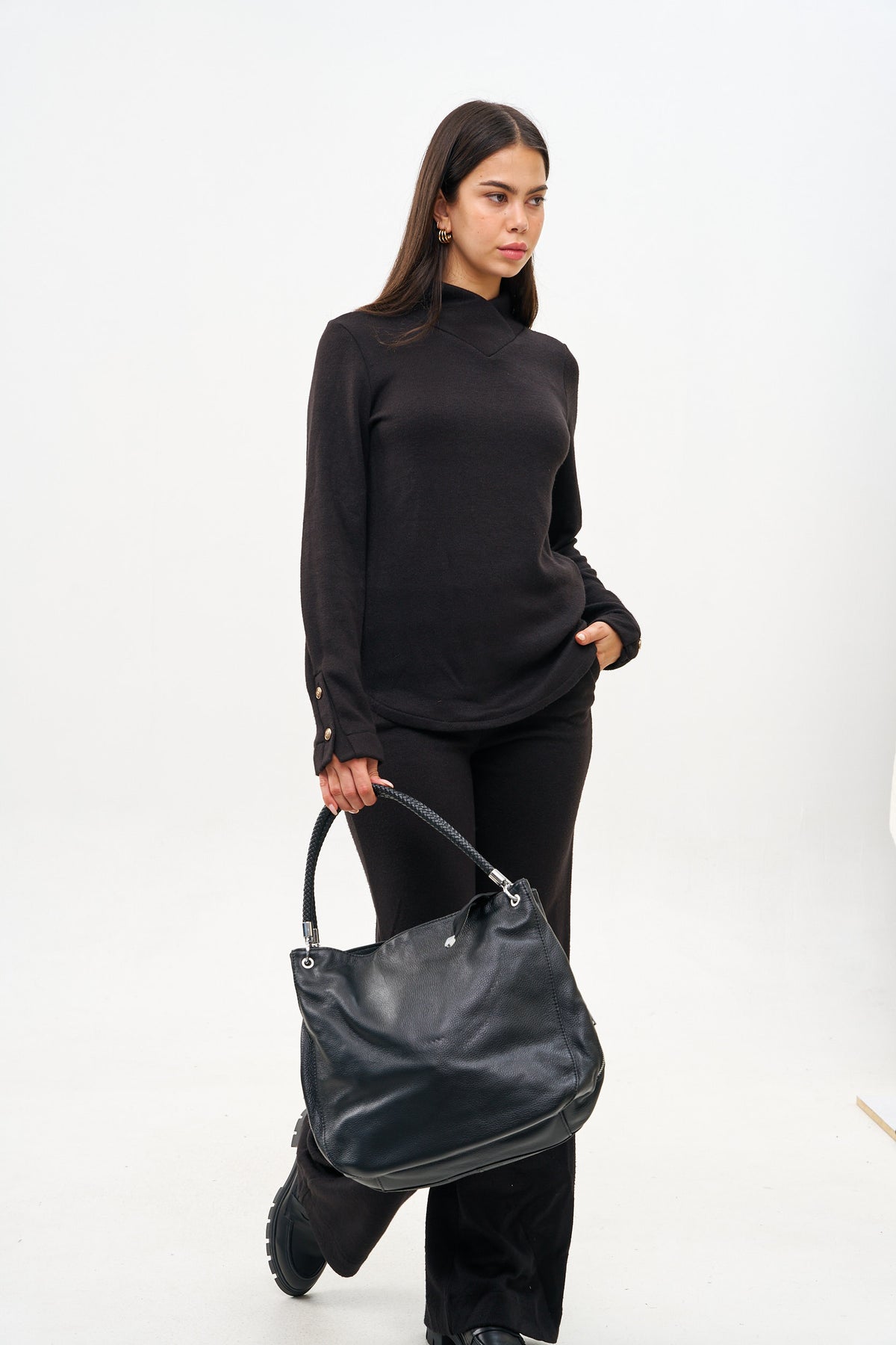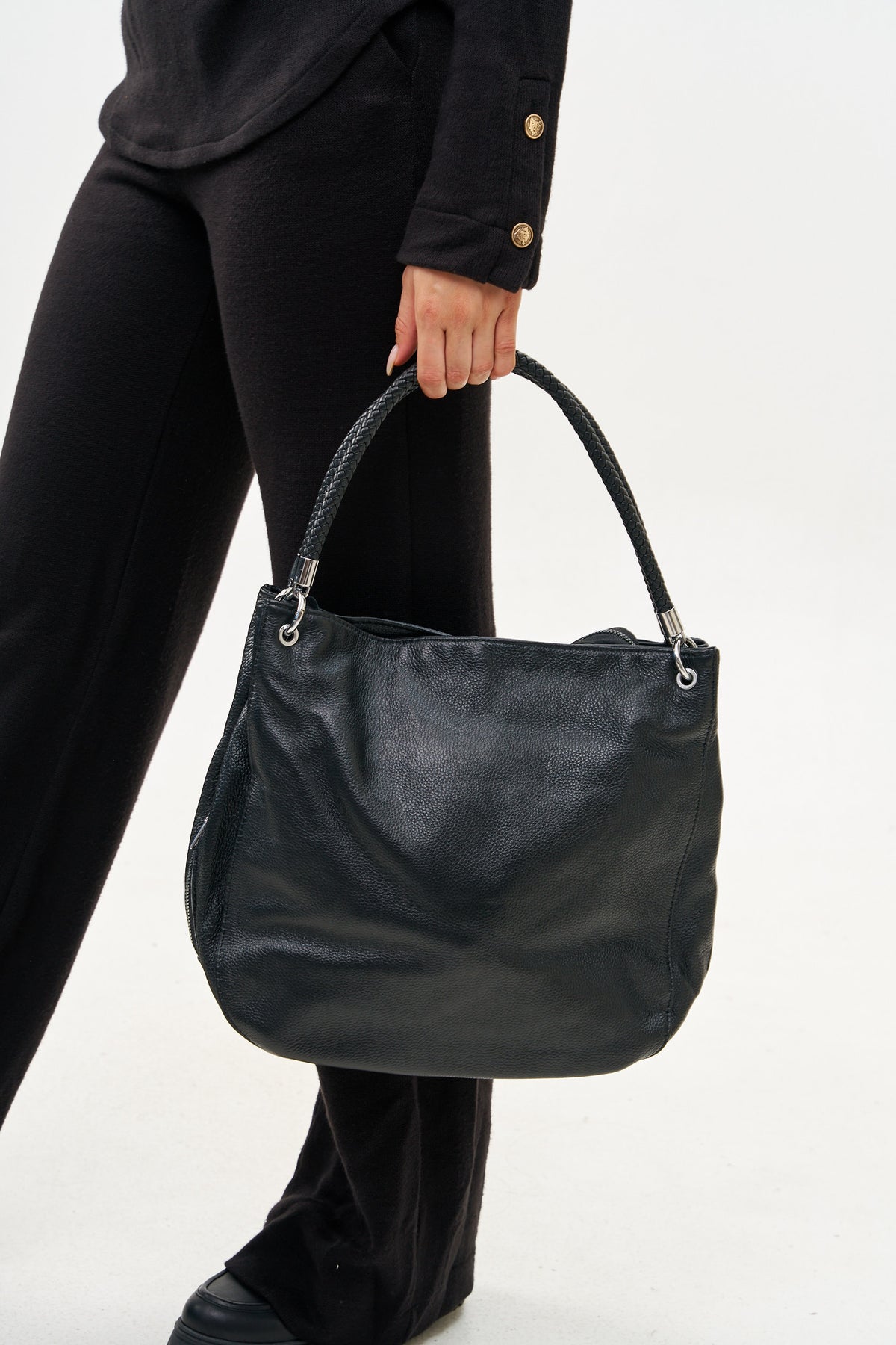 תיק כתף מעור 100% במראה רך עם מרקם גרעיני (pebbled), ורצועה קלועה אלגנטית לנשיאה נוחה כל היום. עשוי מעור אמיתי רך ונעים למגע, עמיד לשימוש יומיומי סילואט מעוגל שמונח יפה על הכתף ומחמיא ללוק סגירת רוכסן עליונה לשמירה בטוחה על התכולה תא מרכזי מרווח עם כיסי ארגון פנימיים לאחסון נוח של טלפון, מפתחות וארנק פרזול מתכתי בגוון כסף ורצועת כתף קלועה רחבה ונוחה