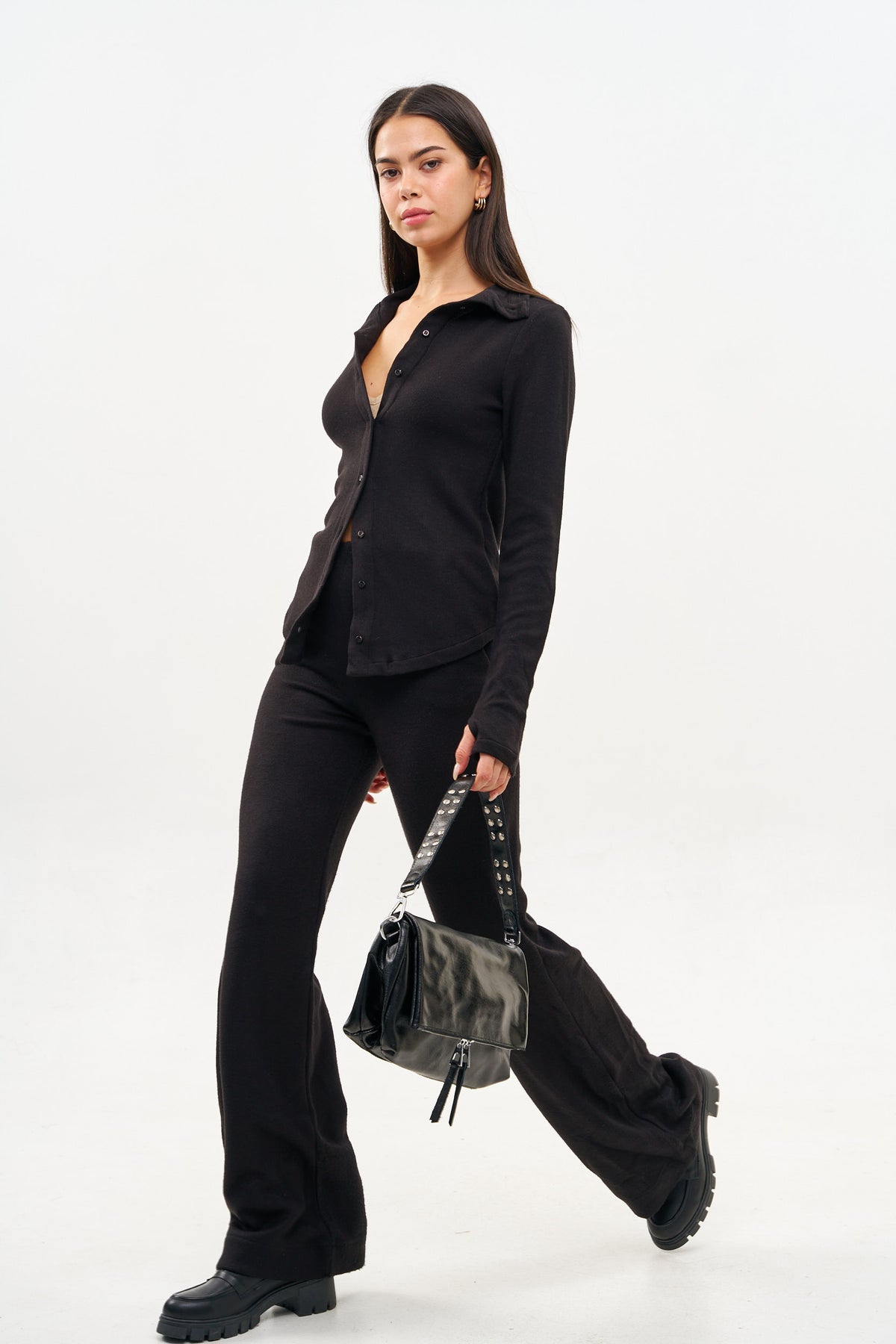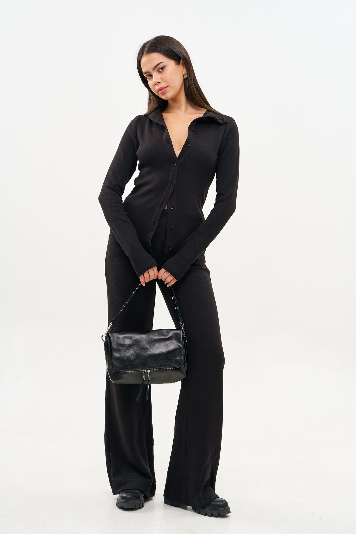 תיק עור 100% עם דש ורצועה רחבה מעוטרת ניטים, אלגנטיות עם קריצה אורבנית. עשוי מעור אמיתי רך עם ברק עדין דש עליון וסגירת רוכסן כפולה לשמירה מלאה על התכולה רצועת כתף רחבה ונוחה, נשלפת; פרזול מטאלי איכותי בגוון כסף גודל אידאלי לשגרה ולעיר, נכנסים בקלות ארנק, משקפי שמש ומחברת קטנה