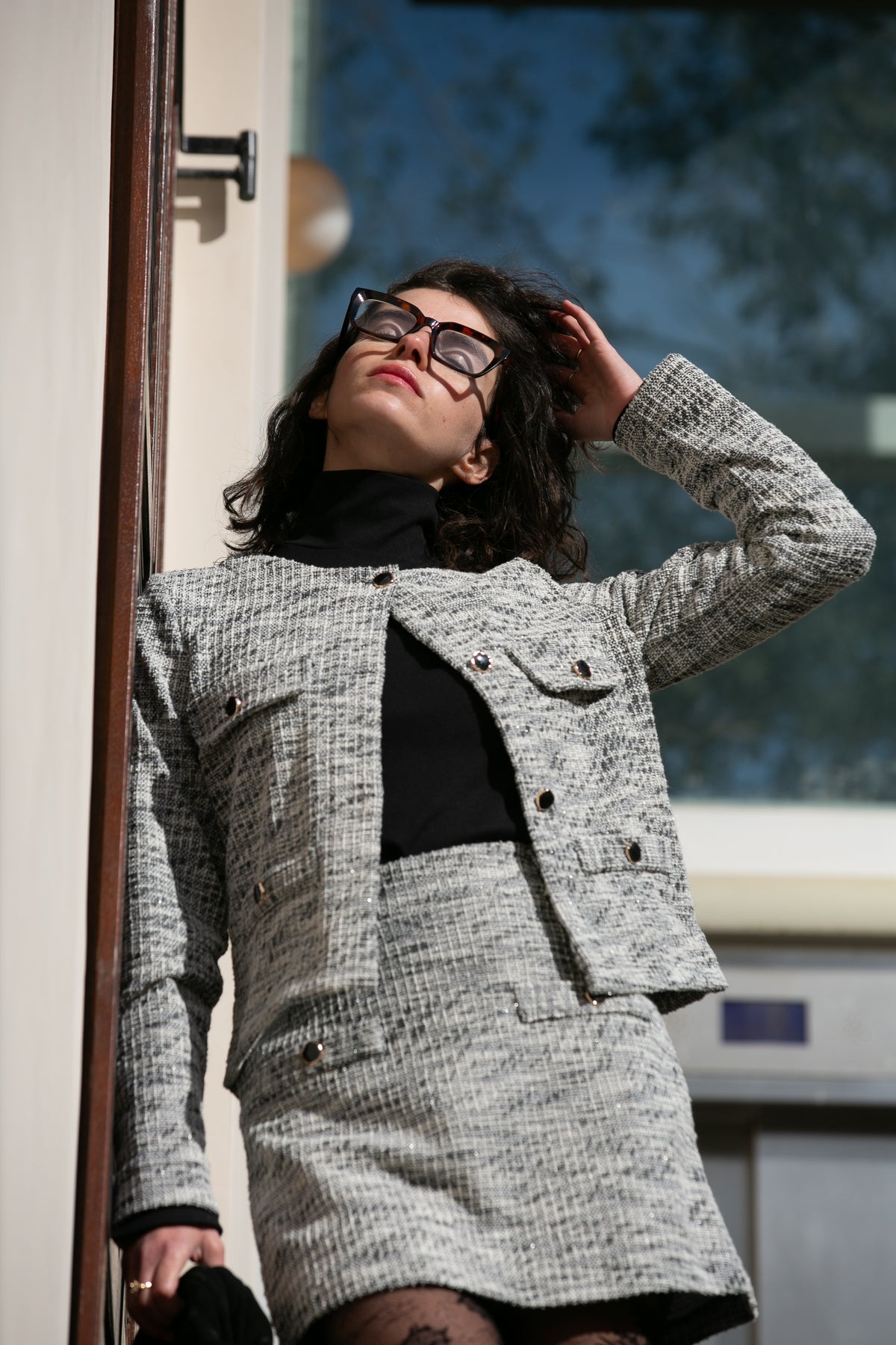 חצאית-מכנס מאריג טוויד בשילוב חוטי לורקס עדיניםגומי בגב ודמי כיסי שפה בקדמי וכפתור קישוטהרכב הבד:95% פוליאסטר, 5% לייקרה