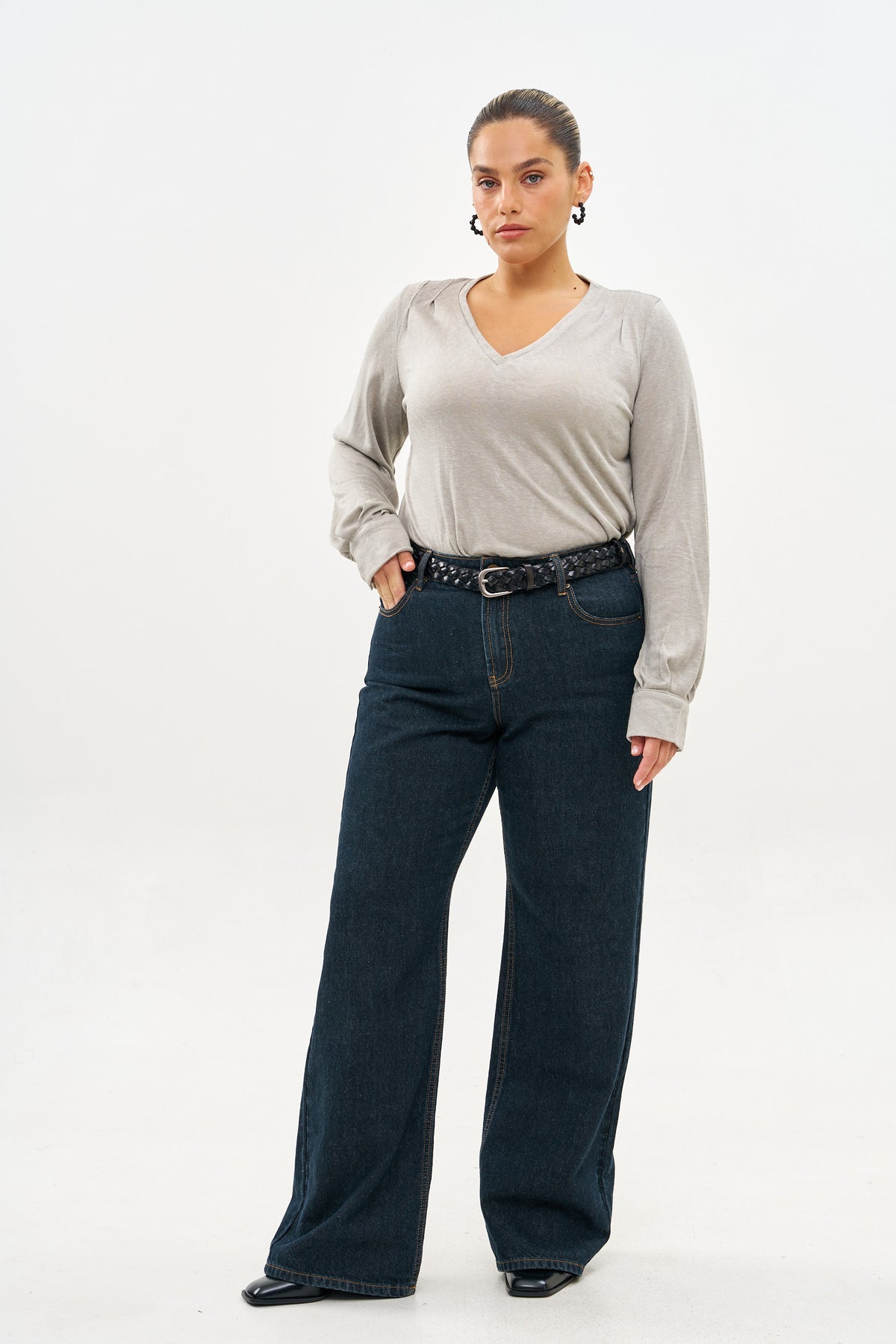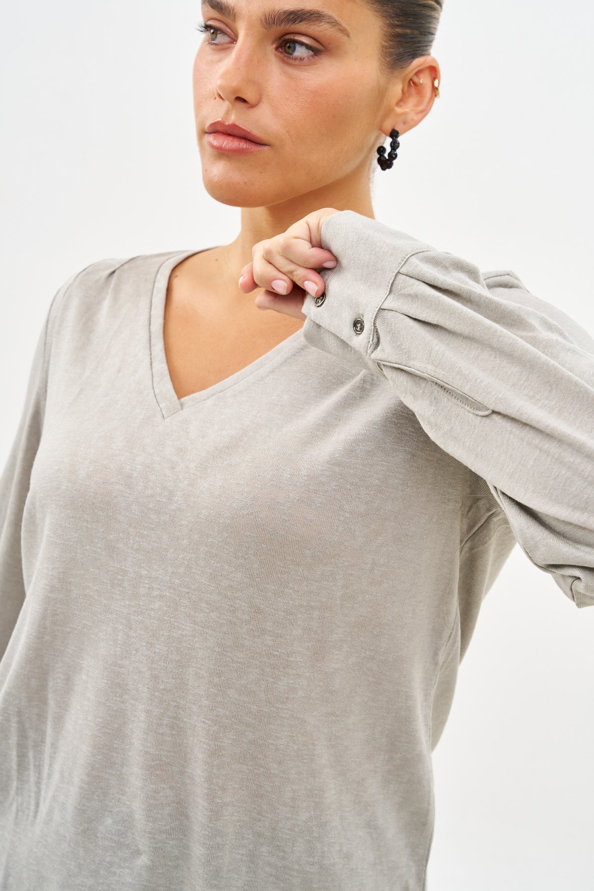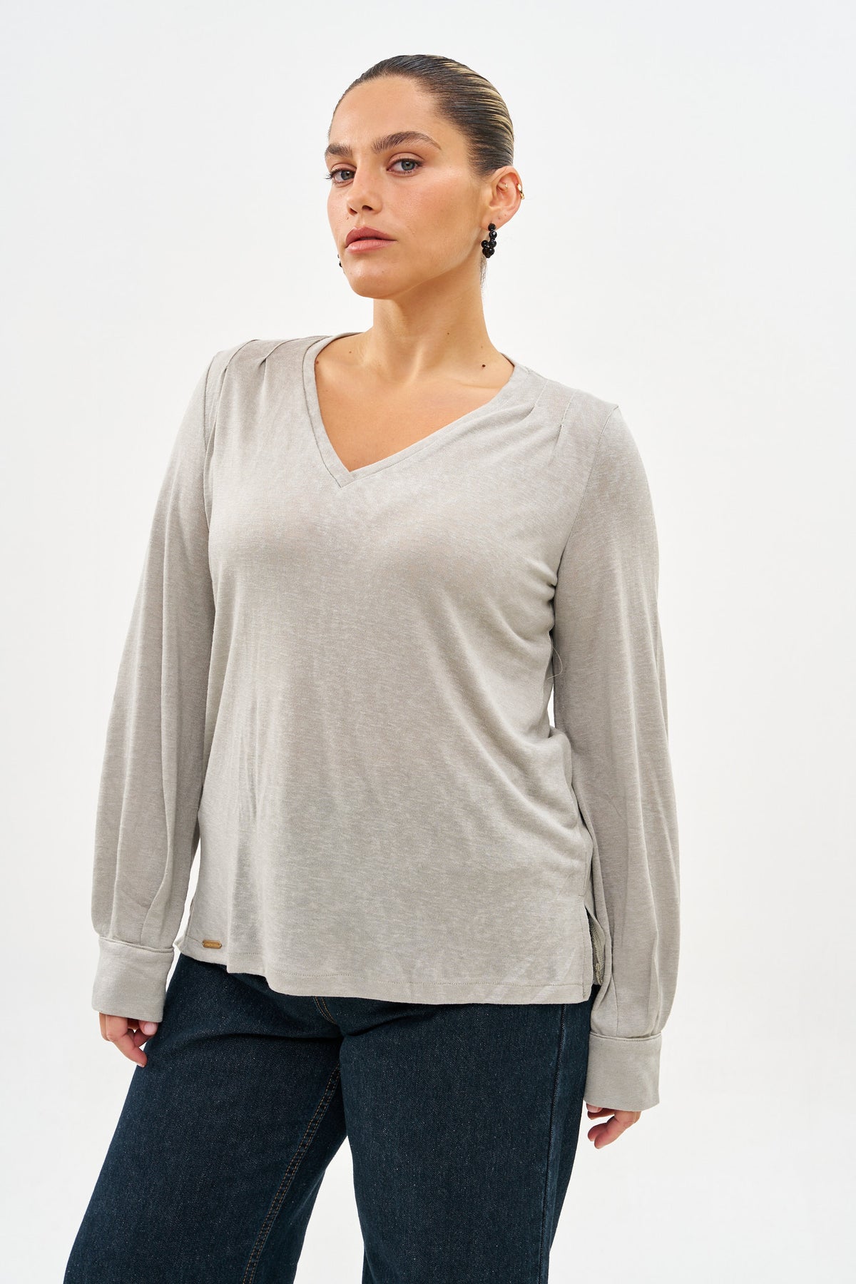 חולצת סלאב מחשוף Vקפלים מהכתף בקדמי וקפל בגבמנג'ט עם כפתורים קטניםהרכב הבד:55% פוליאסטר, 35% ויסקוזה, 10% פשתן