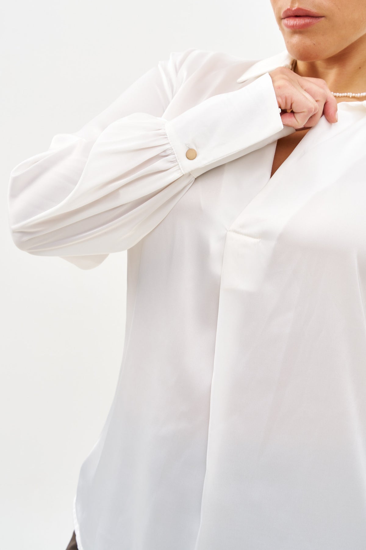 חולצת סאטן עם צווארוןקפל במחשוף וחפתים רחבים עם כפתור מוזהבהרכב הבד:100% פוליאסטר