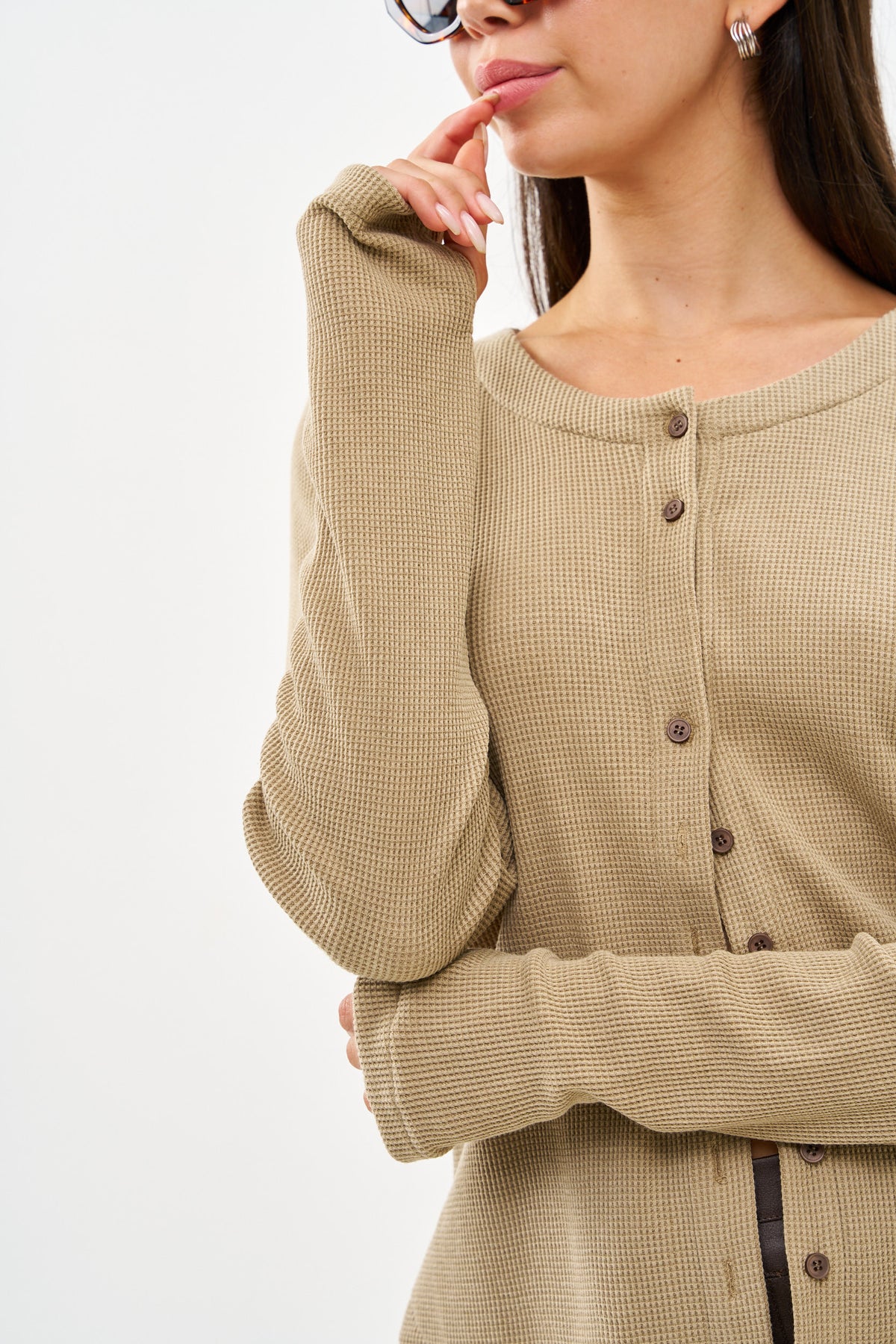 חולצת סריג וופל מכופתרת ללא צווארוןמכפלת מעוגלת ופתחים באגודל בשרווליםהרכב הבד:65% כותנה, 30% פוליאסטר, 5% לייקרה
