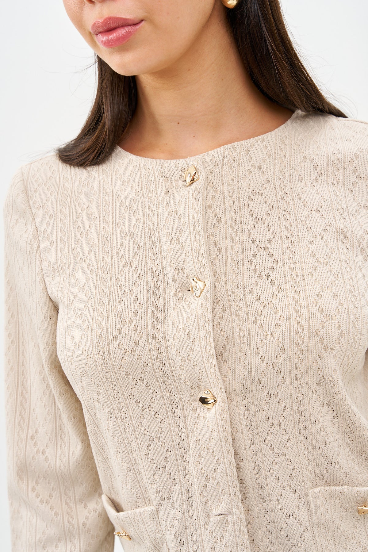 עליונית סריג ללא צווארוןכיסים בקדמי וכפתורים מוזהביםהרכב הבד:95% פוליאסטר, 5% לייקרה
