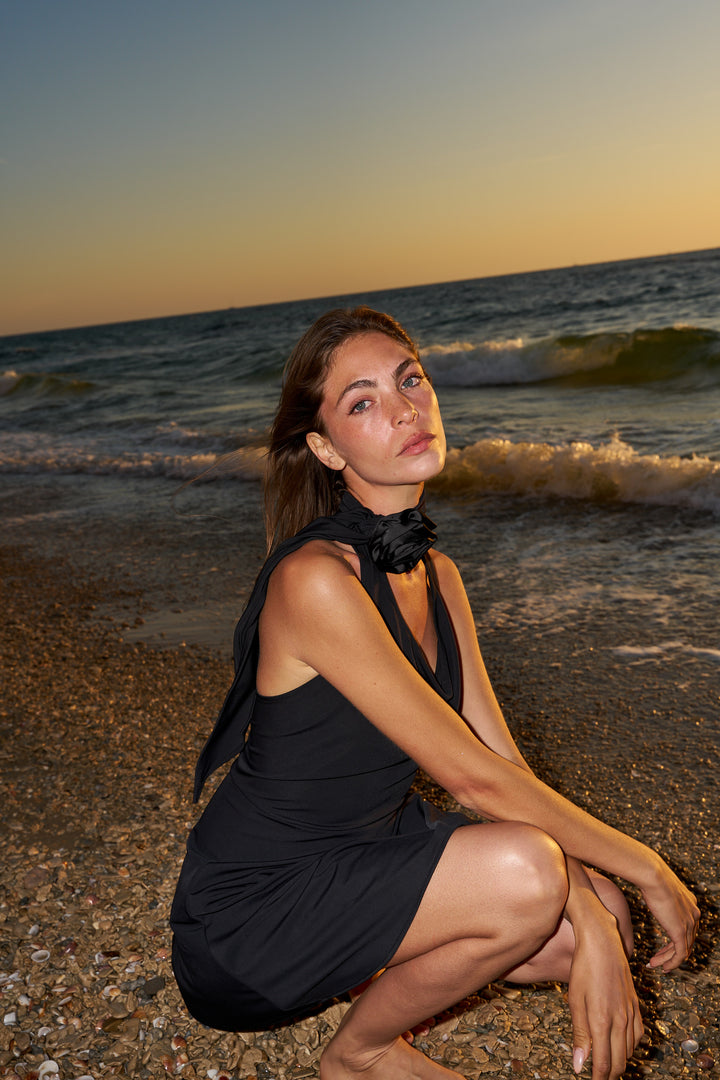שמלה מבד לייקרה מחטבמחשוף רבידה עדין עם לולאה בגב להשחלה של הצעיף חתך במותן A-LINE וגזרת בחצאית הרכב הבד:95% פוליאסטר, 5% לייקרה