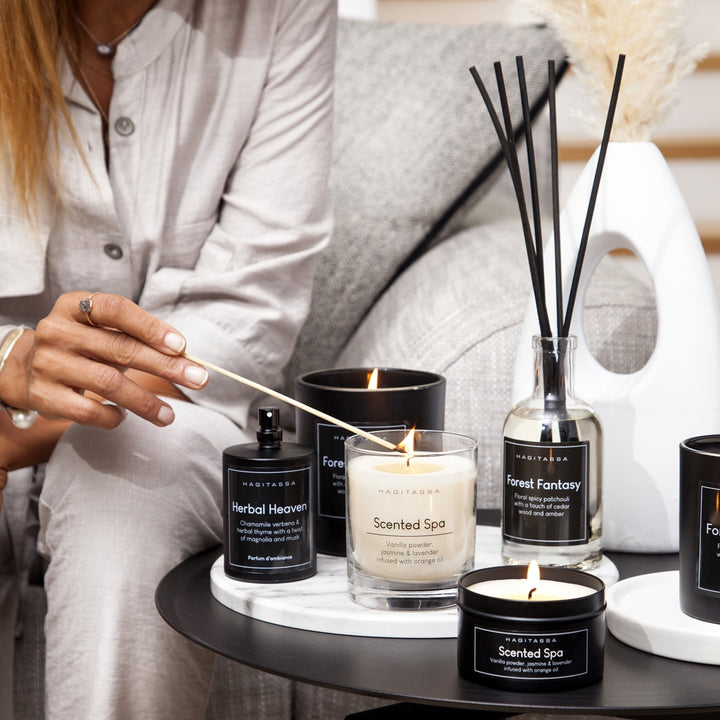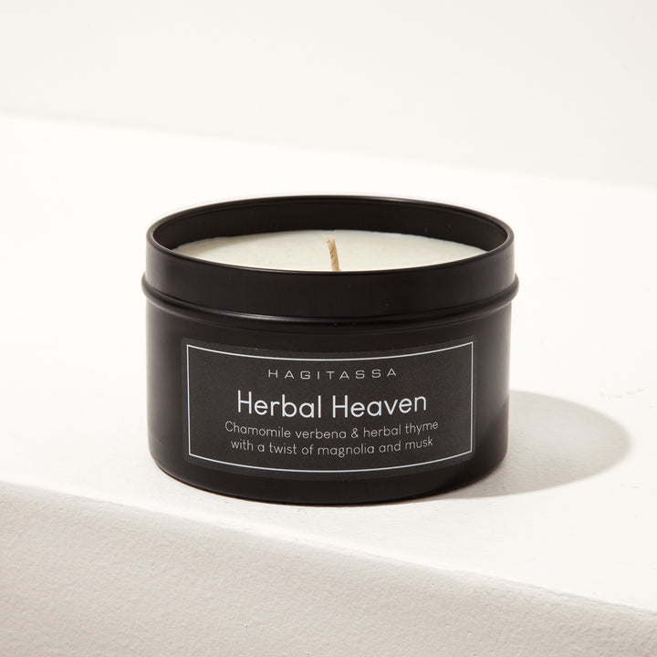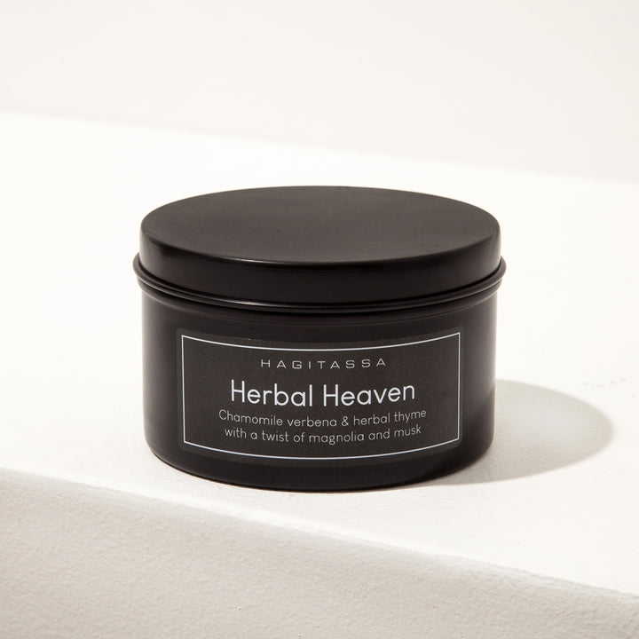 נר מפנק בעיצוב מינימליסטי ומדוייק בריח Herbal Heaven- תערובת תבלינים משכרת של קמומיל, לואיז-00ה, טימין וטוויסט של מגנוליה ומאסק.