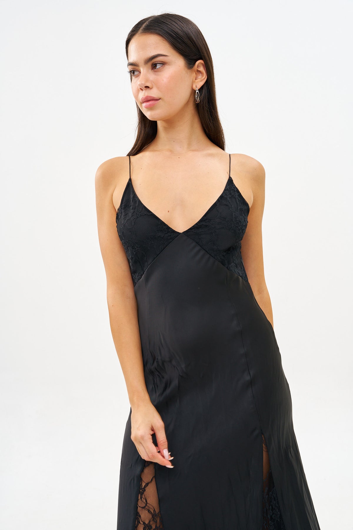 שמלת מקסי סאטן מקומט בשילוב תחרה במחשוף