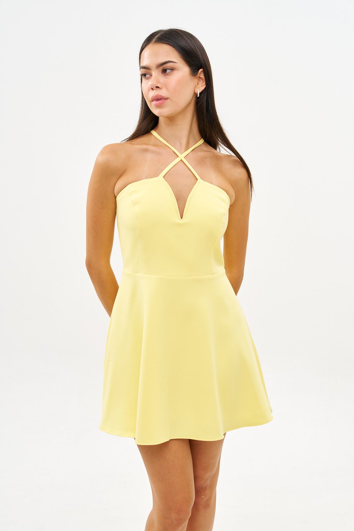 שמלת פעמון קצרהמחשוף עם אבזם פנימי וכתפיות הממשיכות את ה-Vקווי פרינסס מחמיאים בקדמי ורוכסן נסתר בגבהרכב הבד:95% פוליאסטר, 5% לייקרה